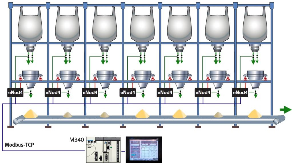 • 7 контролерів дозування eNod4-D на Modbus-TCP — для керування процесом наповнення та дозування