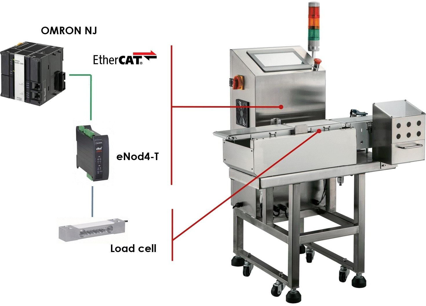 Контролер eNod4-T обробляє сигнал від тензодатчика, застосовує потужне цифрове фільтрування та передає вимірювання до ПЛК Omron NJ з максимальною швидкістю. Завдяки високій частоті вимірювань і швидкій передачі даних через EtherCAT система досягає стабільної точності навіть на високих швидкостях.