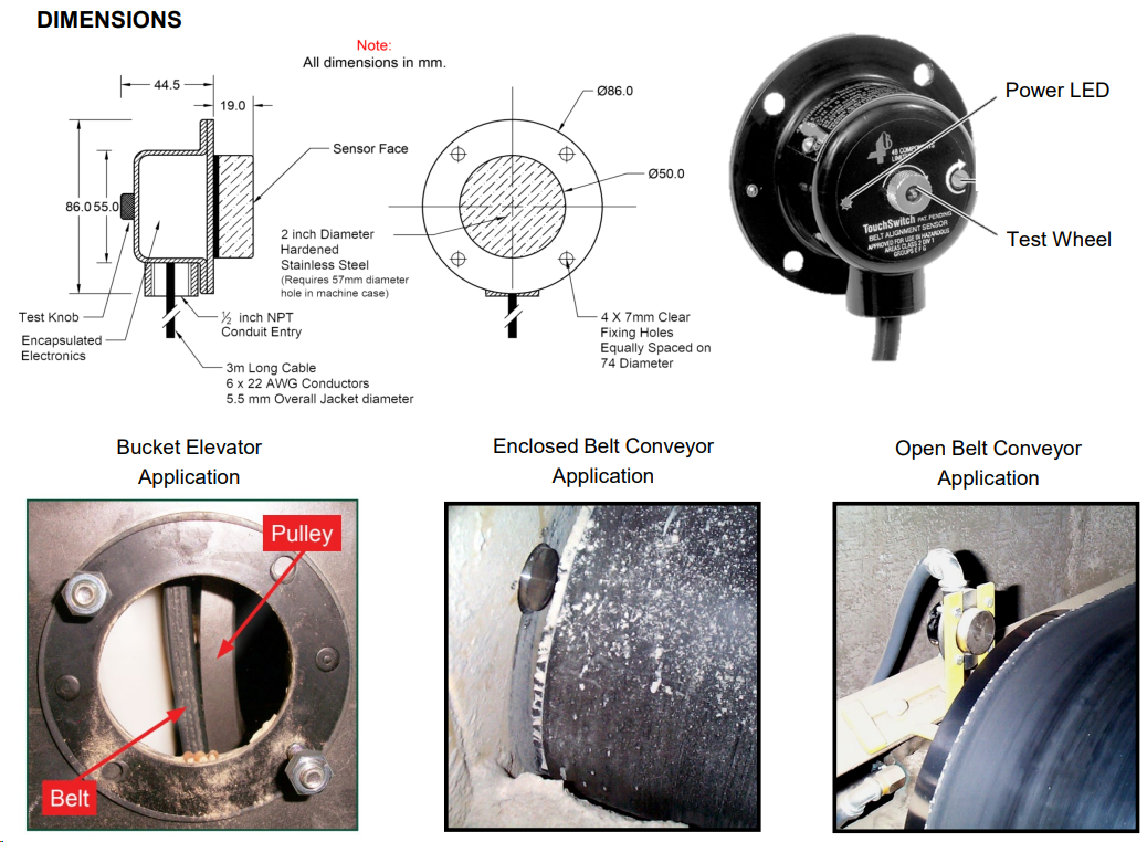 Ключові слова: TOUCHSWITCH датчик, сенсорний перемикач сходу стрічки, TS2V34AI 4B, контроль вирівнювання ременів, ATEX TOUCHSWITCH, датчик зсуву конвеєра, моніторинг стрічки елеватора, 4B Braime TOUCHSWITCH