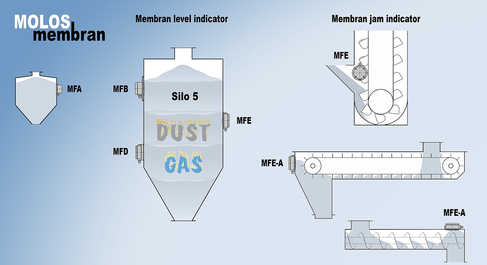 Мембранні сигналізатори рівня MOLOSmembran MF застосовуються для моніторингу сипучих матеріалів у силосах, бункерах та контейнерах у галузях: харчова промисловість, фармацевтика, хімія, цементне виробництво, енергетика, деревообробка. Ідеальні для вибухонебезпечних зон (ATEX), грубозернистих/клейких речовин, малих ємностей, точок з ризиком заторів та важкодоступних місць (без виступаючих частин).