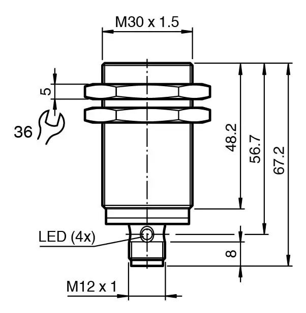 Тип установки та Корпус: Вбудовуваний (Flush), циліндричний корпус M30 x 1.5.
