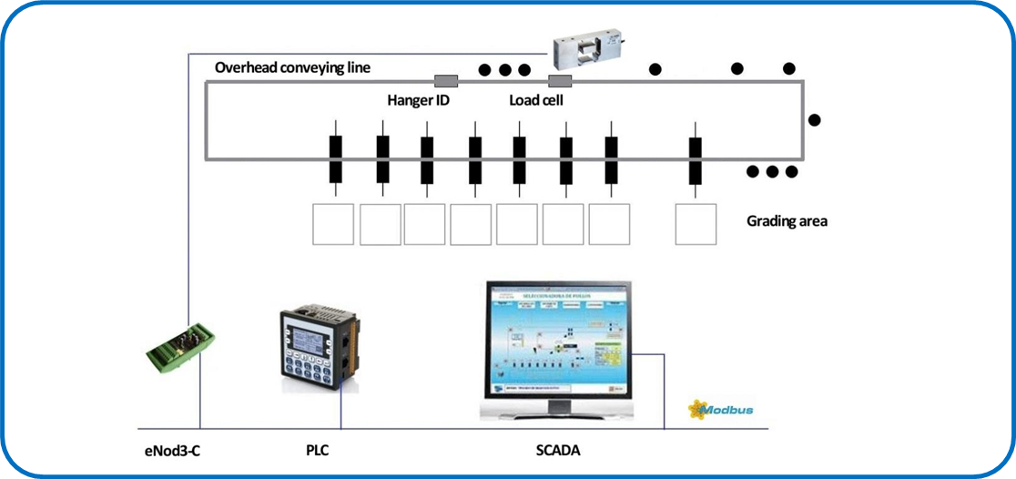 ПЛК Horner XLE-105 з вбудованим HMI керує загальною роботою лінії та ідентифікацією гачків. Після проходження кожного гачка контролер eNod3-C передає лише значення ваги до ПЛК, який миттєво скидає курку у потрібну секцію. Для візуалізації використовується SCADA Indusoft.