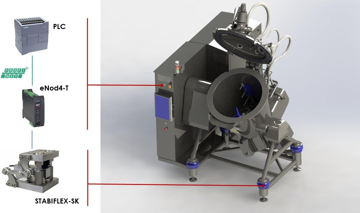 Тензодатчики та комплекти повністю інтегровані в ніжки комбайна, що забезпечує легке очищення та точність зважування 500 г. Контролер eNod4-T обробляє сигнали та передає дані ваги до системи автоматизації, дозволяючи точно дозувати кожен інгредієнт рецепта.