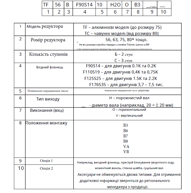 Позначення моделей конічно-циліндрових редукторів типу TC/TF