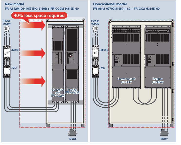 *FR-A842M-06440(315K) або старіша модель має вбудований гальмівний транзистор. Для автономних варіантів не потрібен простір для монтажу та електромонтажні роботи